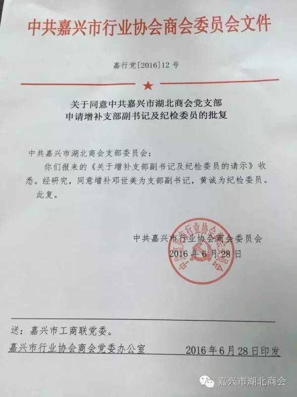 关于同意中共嘉兴市湖北商会党支部申请增补邓世美为副书记及黄诚为纪检委员的批复